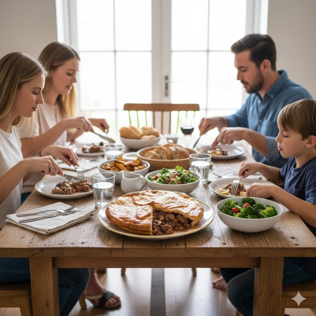 Rich and delicious Steak with Red Wine and Mushroom sauce, deep filled into a shortcrust pastry base and topped with a puff pastry lid.
