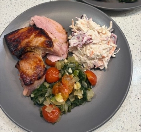 Remove the ham to a board, ready to slice hot, cold or at room temperature. Slice and serve with your chosen sides such as potato wedges, or in a bap for a tasty sarnie! I went with coleslaw, and then a spinach, onion and tomato relish!